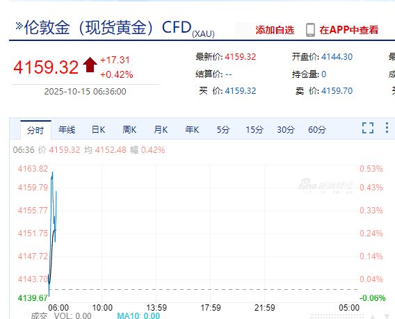 截至10月15日發(fā)稿,現(xiàn)貨黃金報(bào)4159.32美元/盎司。